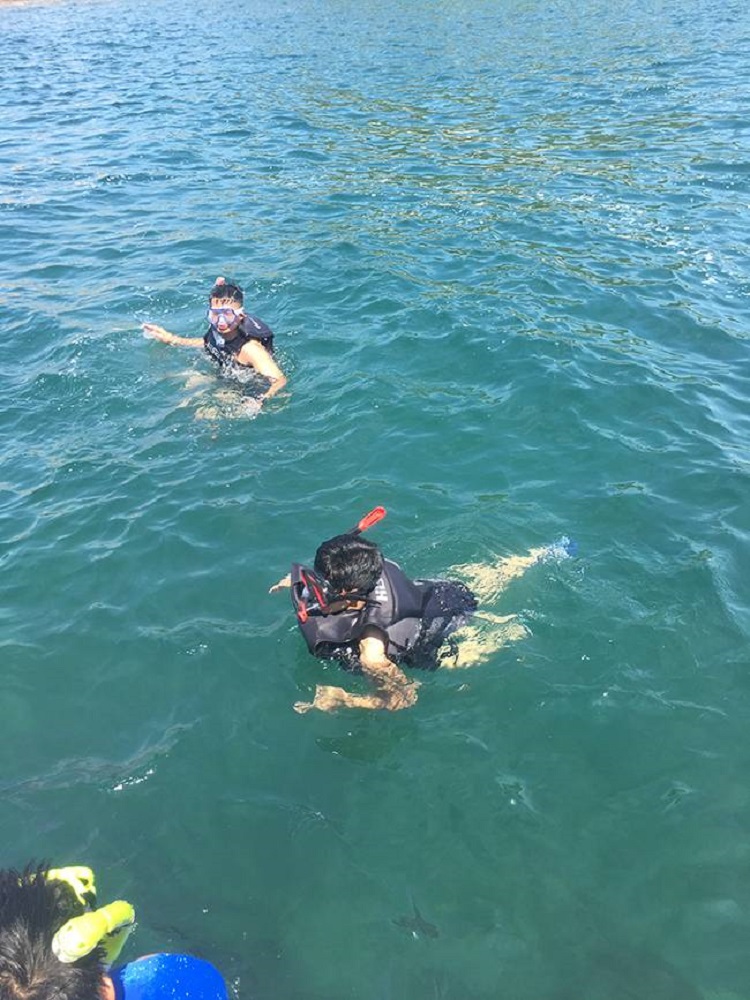 Todos nos buceamos y contemplamos los peces y los corales en el agua.